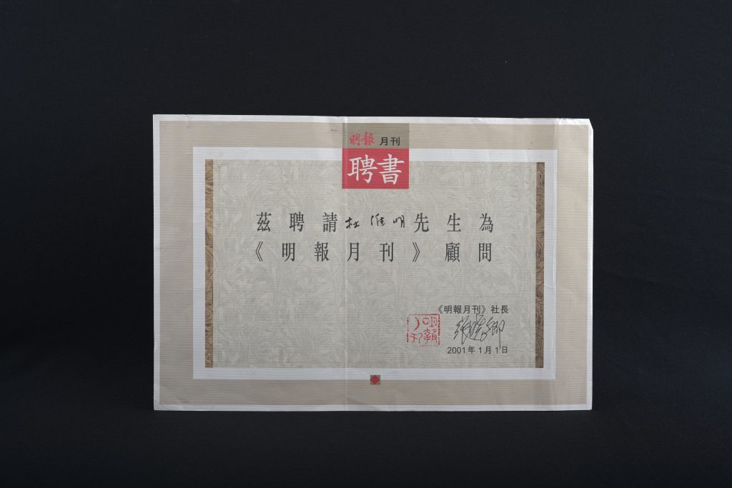 2001年1月1日,杜維明獲聘《明報月刊》顧問。《明報月刊》是一本屬於全球華人的泛文化知識雜誌,由資深報人、著名小說家查良鏞(金庸)先生於一九六六年創辦,乃海內外歷史最悠久的文化刊物。《明報月刊》創刊以來,向以「文化的重鎮,知識的寶庫」為辦刊宗旨,內容涵蓋社會性、知識性、文化性,一直廣受海內外華人和知識界的愛戴及支持。