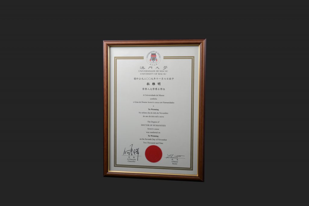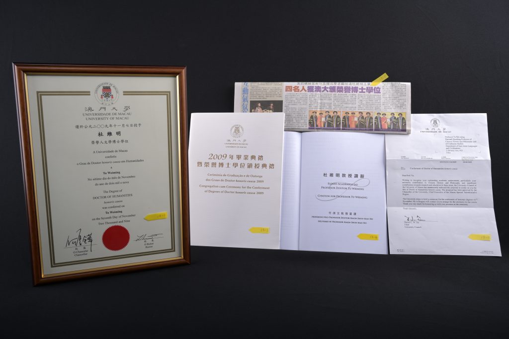 2009年11月7日,澳門大學在正假塔石體育館舉行「2009年榮譽博士學位頒授典禮」。典禮上,澳大會頒授榮譽博士學位予杜維明教授,以表彰其在哲學領域取得的重大貢獻。行政長官兼澳大校監何厚鏵先生將親臨主禮。另外兩位獲頒榮譽博士學位的分別是顧明遠教授和王蒙博士。
