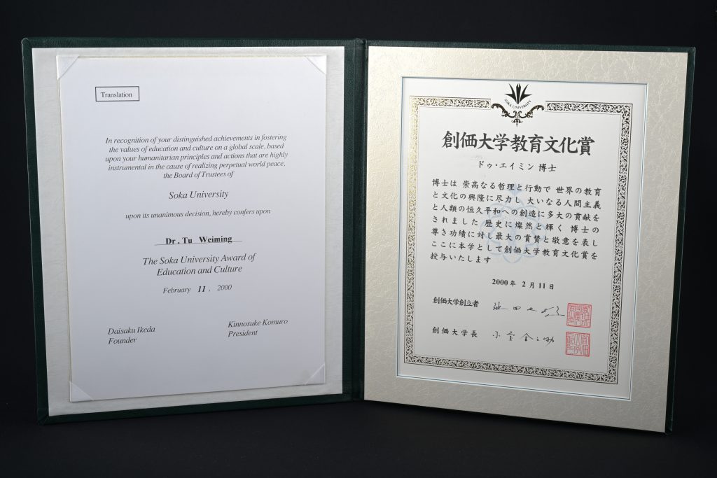2000年,杜維明教授因推動儒學現代化與跨文明對話的卓越貢獻,獲日本創價大學(Soka University)授予「文化教育獎」(Cultural and Educational Recognition Award)。該獎項設立於1991年,每年頒發給1-2位具有國際影響力的學者、思想家或活動家,表彰在文化、教育及和平領域影響全球的傑出人士,杜維明是首位獲獎的華裔學者。