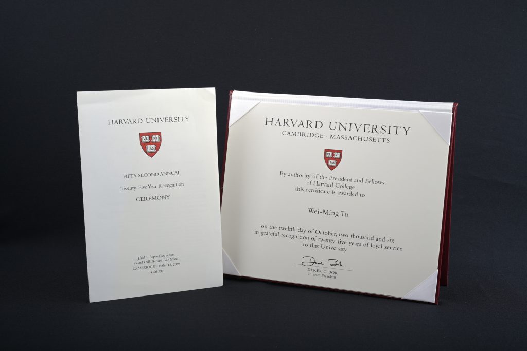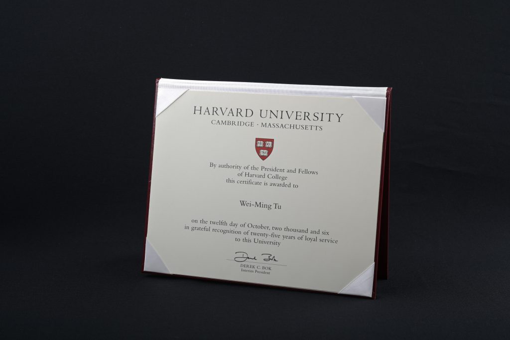 2006年,杜維明教授獲哈佛大學授予任教25周年紀念證書,表彰其作為哈佛東亞研究奠基者的卓越貢獻。他自1981年執教哈佛,開創儒學通識教育體系,主導文明對話全球議程,成為校史上首位獲此殊榮的亞裔哲學家。該紀念證書是哈佛大學授予長期服務教授的特殊榮譽,旨在表彰學者在哈佛持續任教滿25周年的學術忠誠與貢獻。不同於競爭性獎項,此證書代表哈佛對其學術生涯深度融入大學發展的認可,被視為象牙塔內的「終身成就里程碑」。